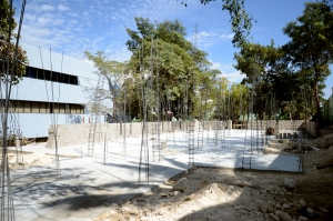 En el inmueble que reporta un avance del 30 por ciento, destaca la conclusión de la cimentación y colado del piso firme, por lo que se preparan ya las estructuras de las columnas para el inicio del levantamiento de los muros perimetrales.