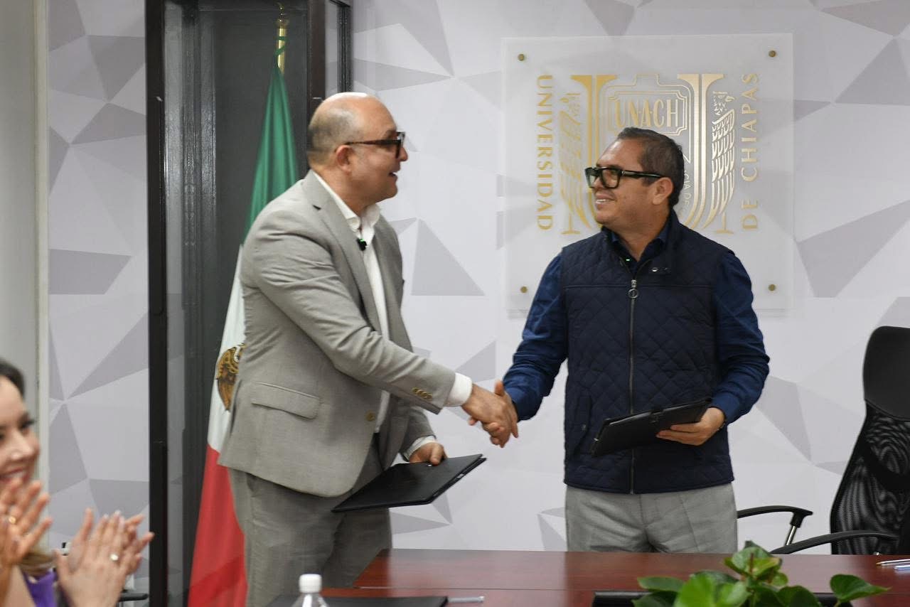 Tuxtla Gutiérrez, Chiapas. - El rector Oswaldo Chacón Rojas y el coordinador Académico de la Escuela Nacional de Formación Judicial, Sergio Javier Molina Martínez, signaron un acuerdo de entendimiento de colaboración académica, en las instalaciones de la rectoría.