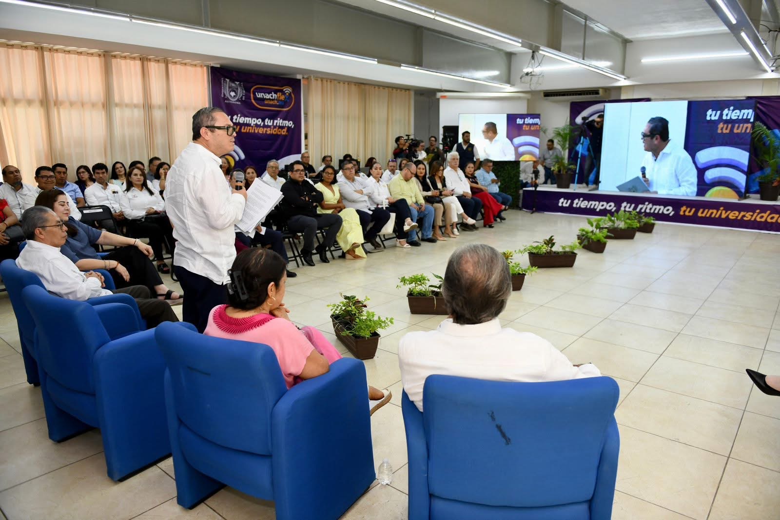 Durante la presentación, el rector Oswaldo Chacón Rojas afirmó que la UNACH tiene que adecuarse a esta nueva realidad y a las necesidades de las personas y UNACH Flex nace precisamente para eliminar esas barreras, no solo con clases en línea, sino con elementos diferenciadores.