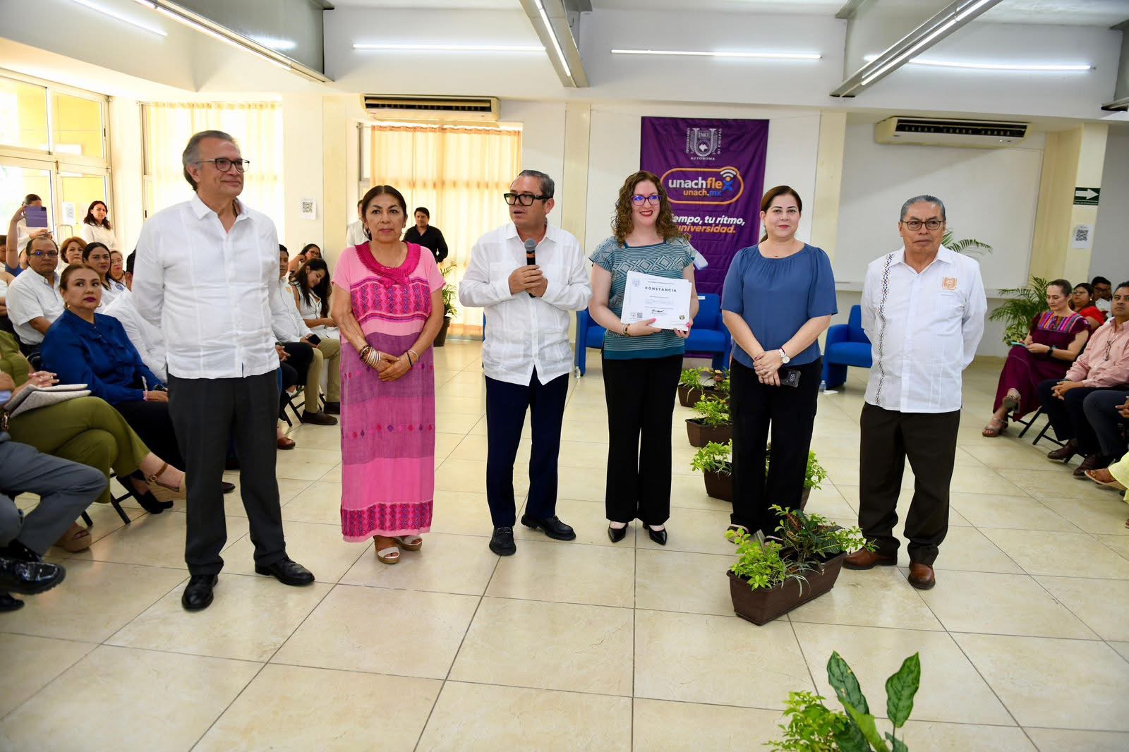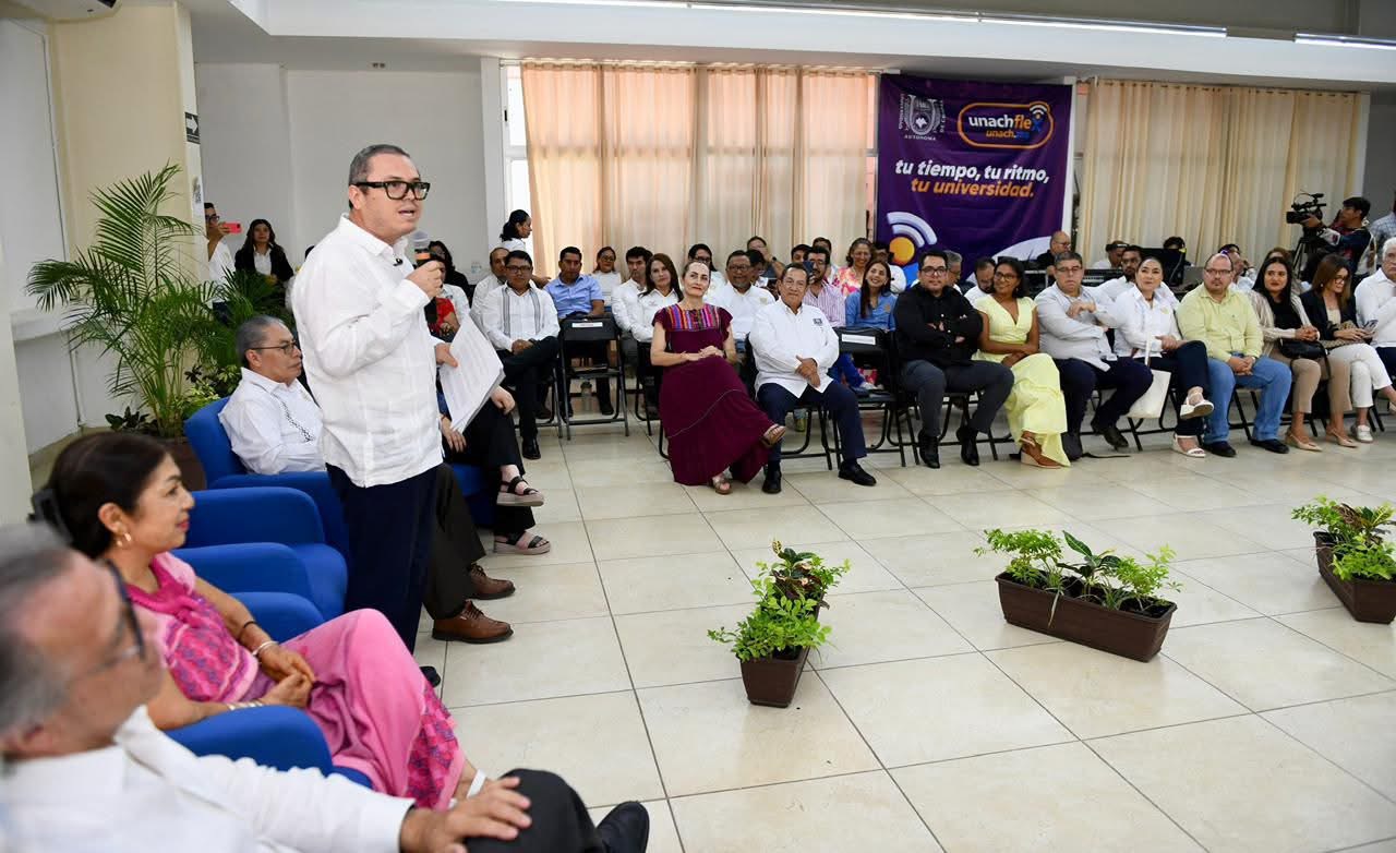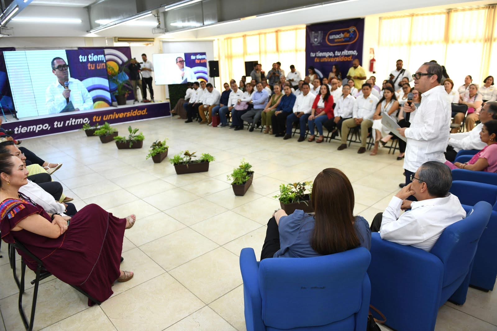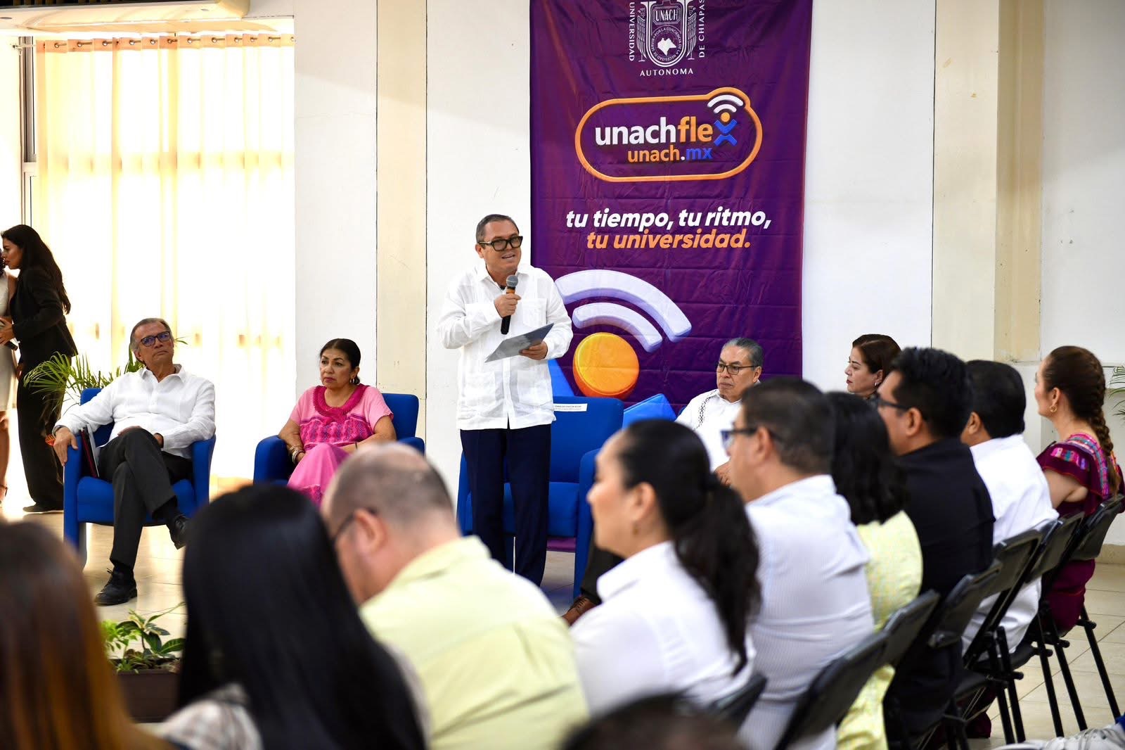 “Vivimos en una sociedad donde miles de personas, sean trabajadores, madres o padres de familia, juventudes que viven en territorios muy lejanos, sobre todo aquí en el estado de Chiapas, profesionales que buscan actualizarse, enfrentan barreras para poder hacerlo, muchos de ellos por el tema económico, la distancia geográfica y horarios incompatibles con las responsabilidades laborales o familiares, para ellos es UNACH Flex”, acotó.