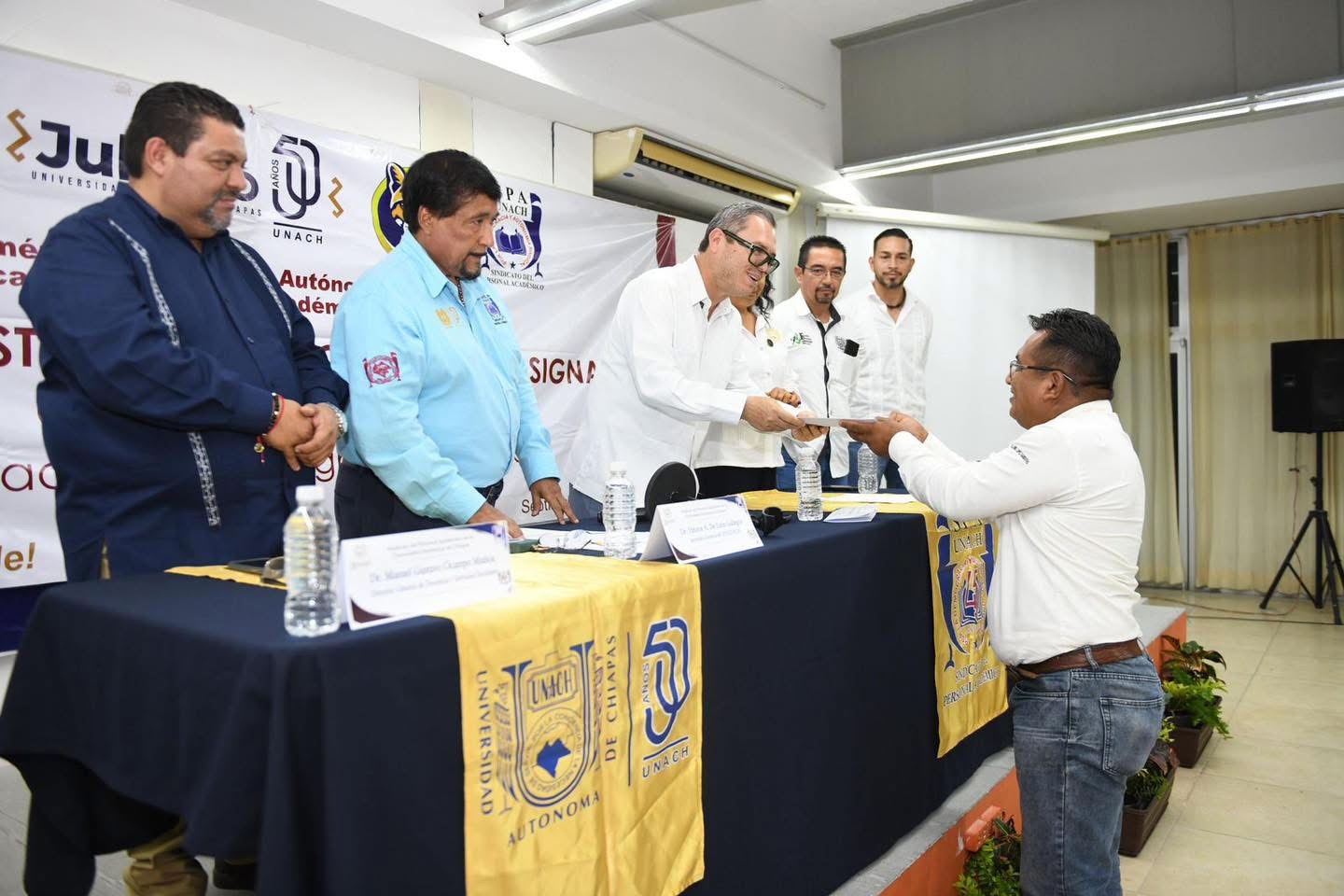 Tuxtla Gutiérrez, Chiapas. - Docentes de asignatura pertenecientes a 15 delegaciones del Sindicato del Personal Académico de la Universidad Autónoma de Chiapas (SPAUNACH) recibieron las constancias de recategorización, de manos del rector Oswaldo Chacón Rojas y el secretario General de esta asociación, Héctor De León Gallegos, en ceremonia realizada en las instalaciones del Aula Polifuncional de la Facultad de Arquitectura.