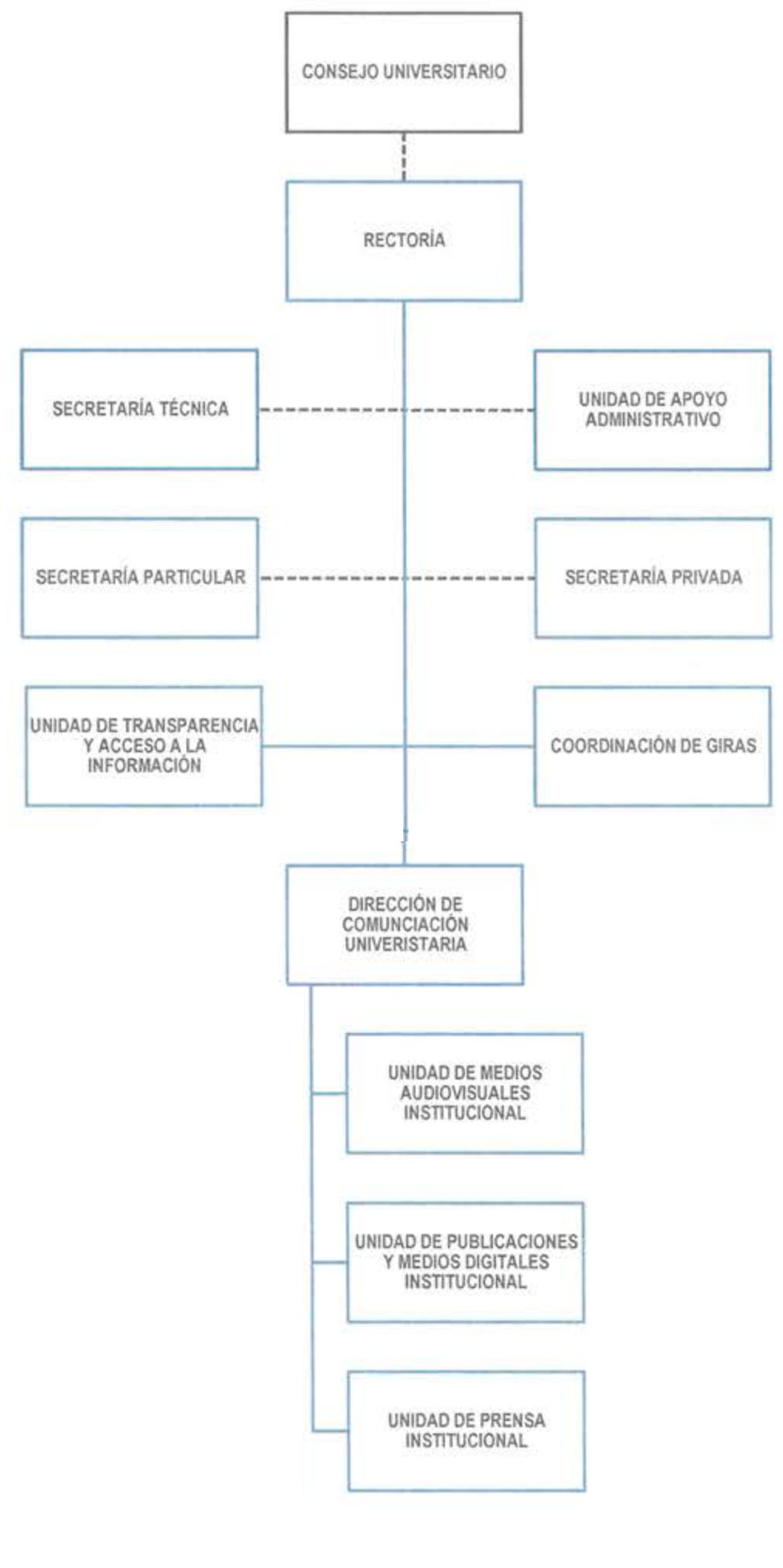 Aunque la Ley Orgánica de la UNACH no especifica explícitamente la creación de un área denominada "Dirección de Comunicación Universitaria", dicha función se encuentra contemplada dentro de las atribuciones generales de la Rectoría y otras áreas administrativas de la universidad. Estas atribuciones incluyen la representación legal de la institución, la gestión de su imagen pública y la coordinación de sus actividades de difusión y relaciones públicas. Por lo que, la figura jurídica que sustenta es administrativa subordinada a la Rectoría, encargada de la gestión de la comunicación institucional en sus diferentes dimensiones.