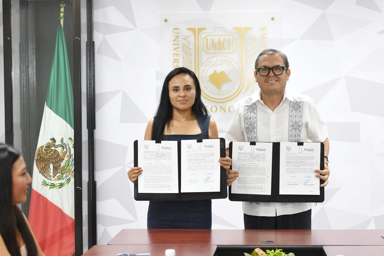 Tuxtla Gutiérrez, Chiapas.- Con miras a la instalación de una sede académica, el rector Oswaldo Chacón Rojas y la presidenta de Tumbalá, Griselda De Jesús Méndez, firmaron un Convenio General de Colaboración y un Convenio Específico de Colaboración para la Inclusión Educativa Universitaria en la Modalidad No Escolarizada, en ese municipio.