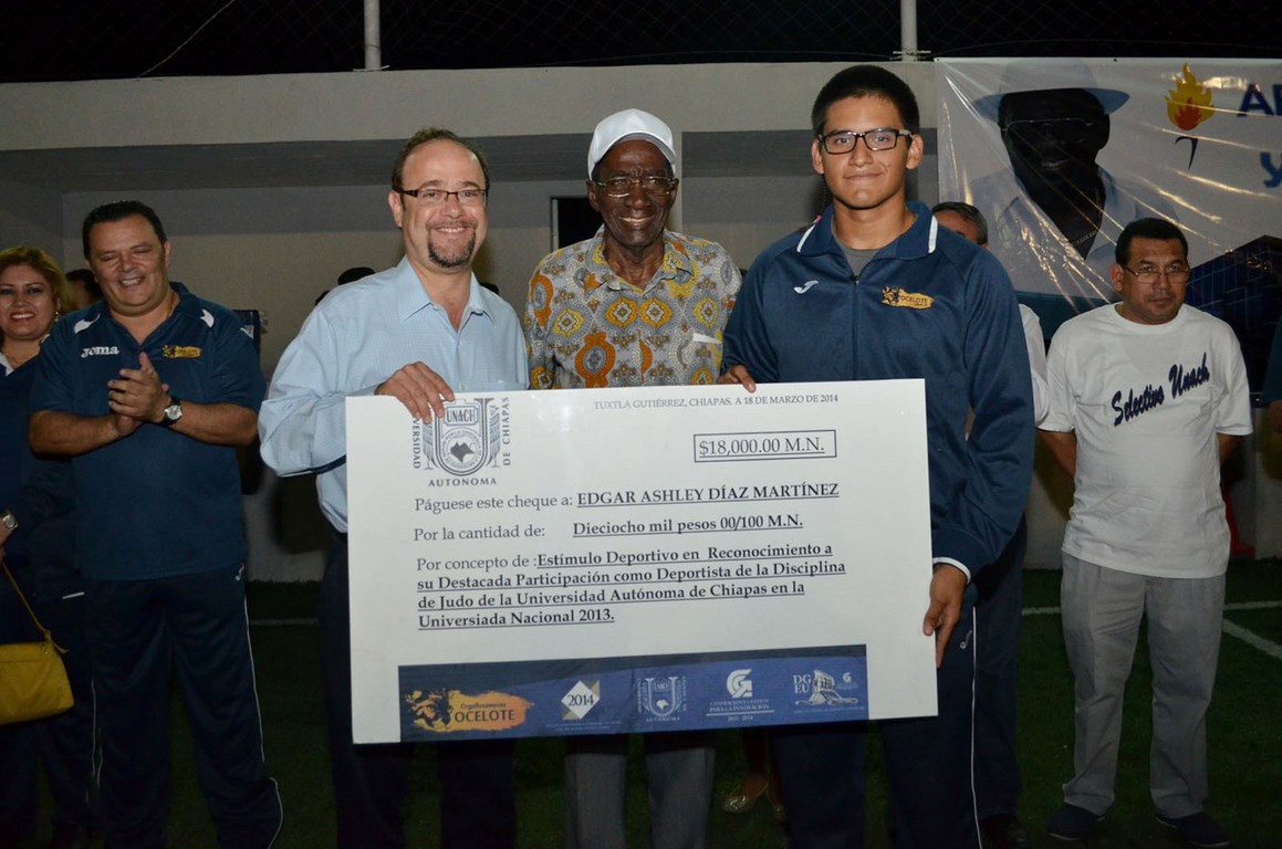 Posteriormente, el rector de la UNACH entregó estímulos económicos a los estudiantes Melissa Morales del Ángel y Edgar Ashley Díaz Martínez, que obtuvieron medallas en la disciplina de tae kwon do y judo, respectivamente, en ediciones anteriores de la Universidad en su etapa nacional.