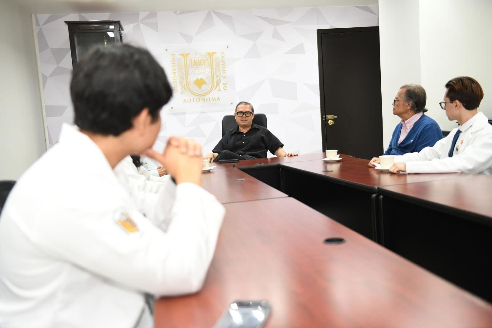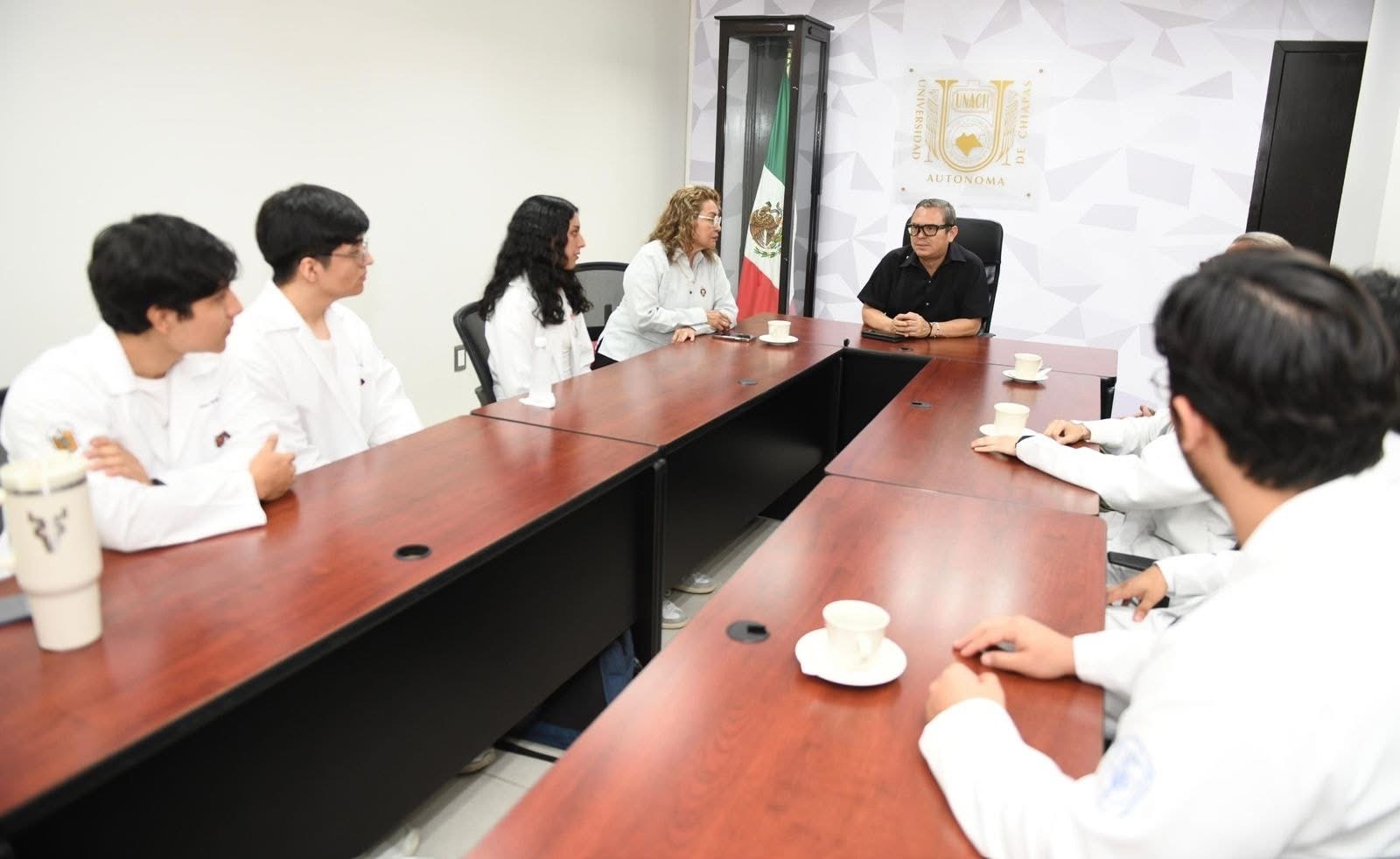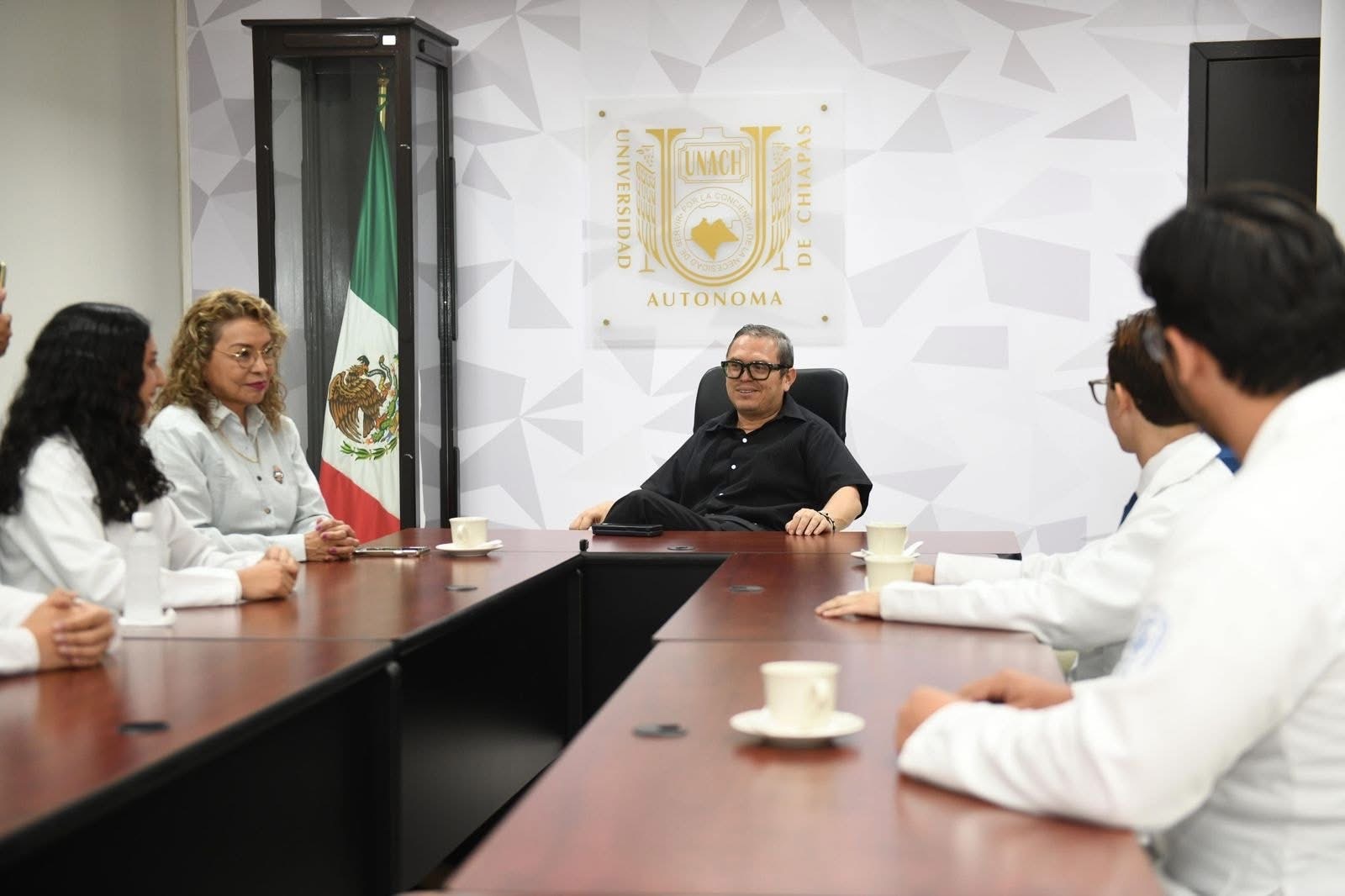 Tuxtla Gutiérrez, Chiapas. - Estudiantes de la Facultad de Medicina Humana “Dr. Manuel Velasco Suárez” Campus II de la Benemérita Universidad Autónoma de Chiapas, que representarán al estado y a México en el World Congress of Neurosurgery (WFNS 2025) a desarrollarse en Dubái, se reunieron con el rector Oswaldo Chacón Rojas, en las instalaciones de la Colina Universitaria.