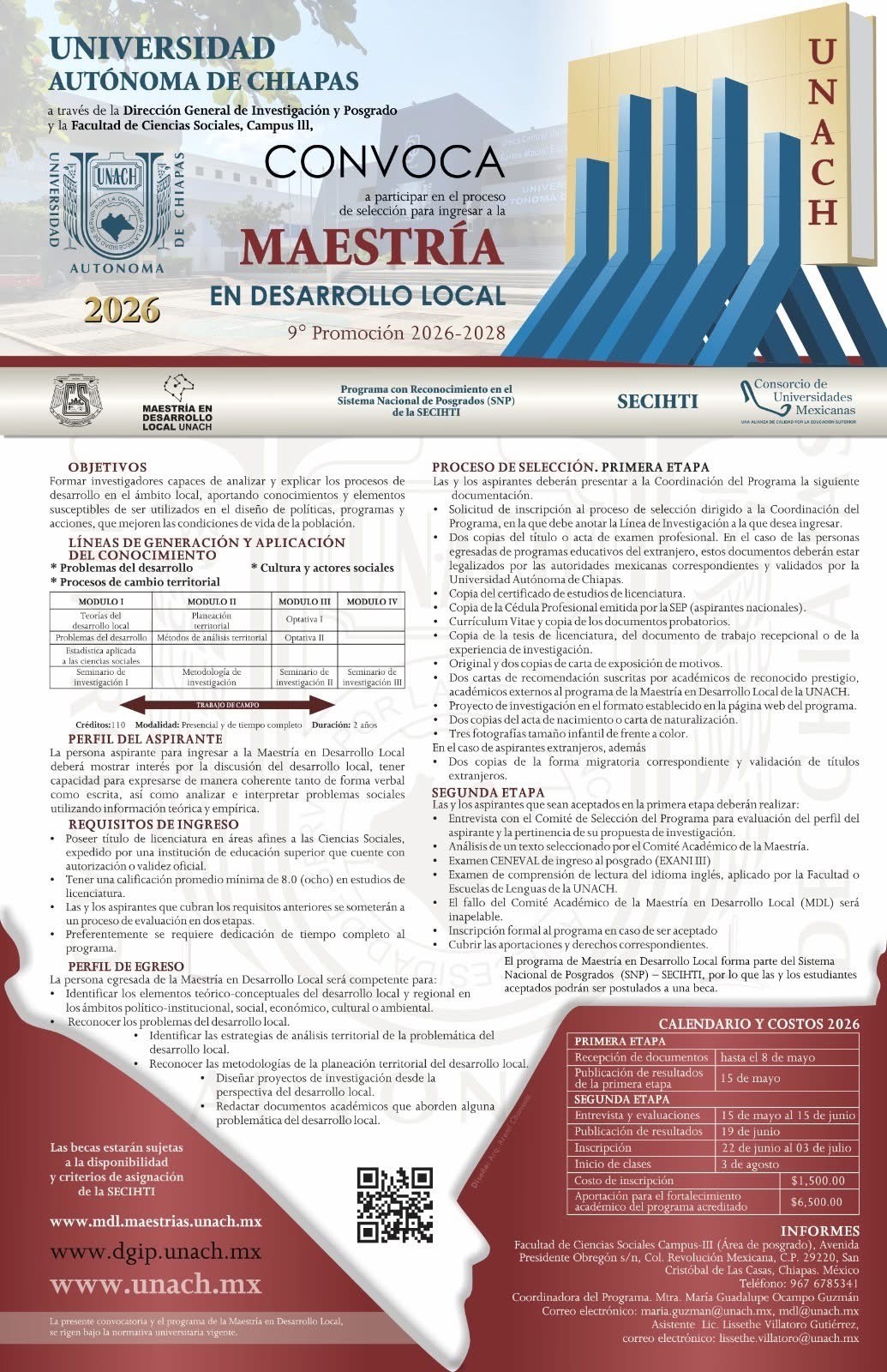 Tuxtla Gutiérrez, Chiapas.- La Benemérita Universidad Autónoma de Chiapas tiene abierta la convocatoria para formar parte de la 9a. Promoción de la Maestría en Desarrollo Local 2026-2028.