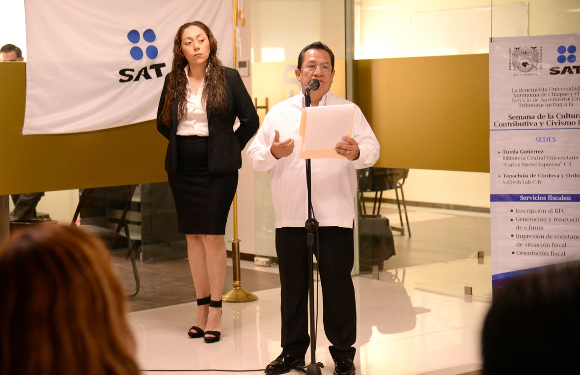 Tuxtla Gutiérrez, Chiapas.- La Benemérita Universidad Autónoma de Chiapas, en coordinación con el Servicio de Administración Tributaria (SAT), puso en marcha en la Biblioteca Central Universitaria, la “Semana de la Cultura Contributiva y Civismo Fiscal”.